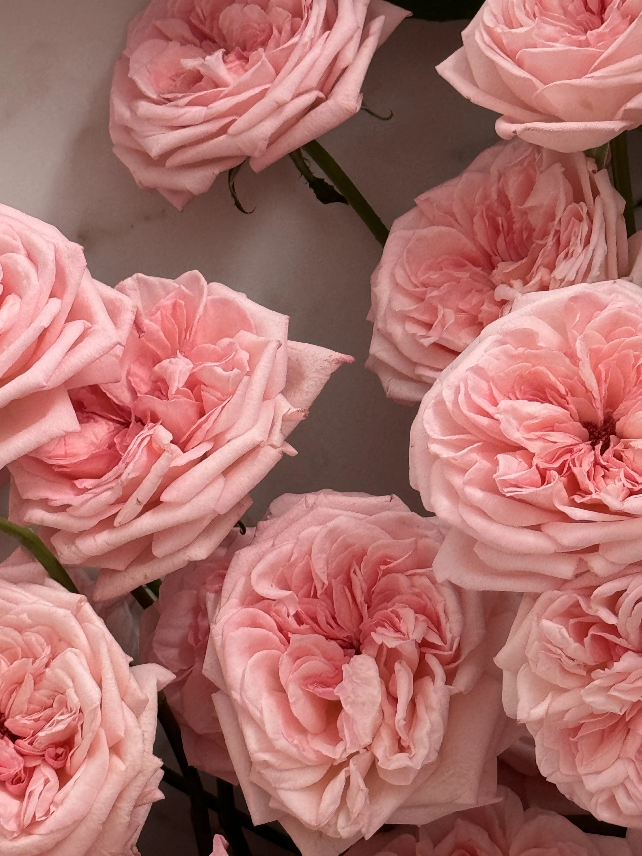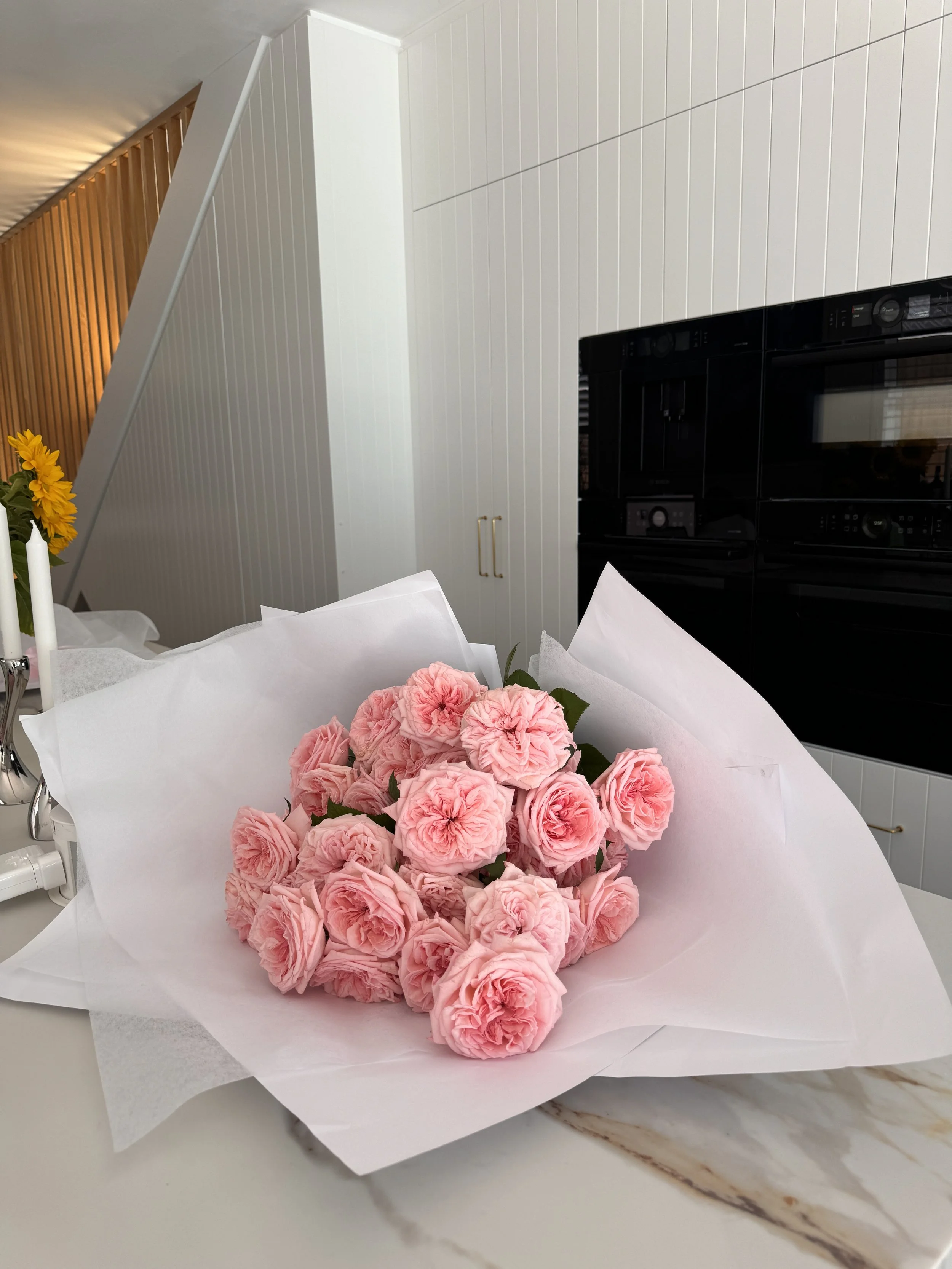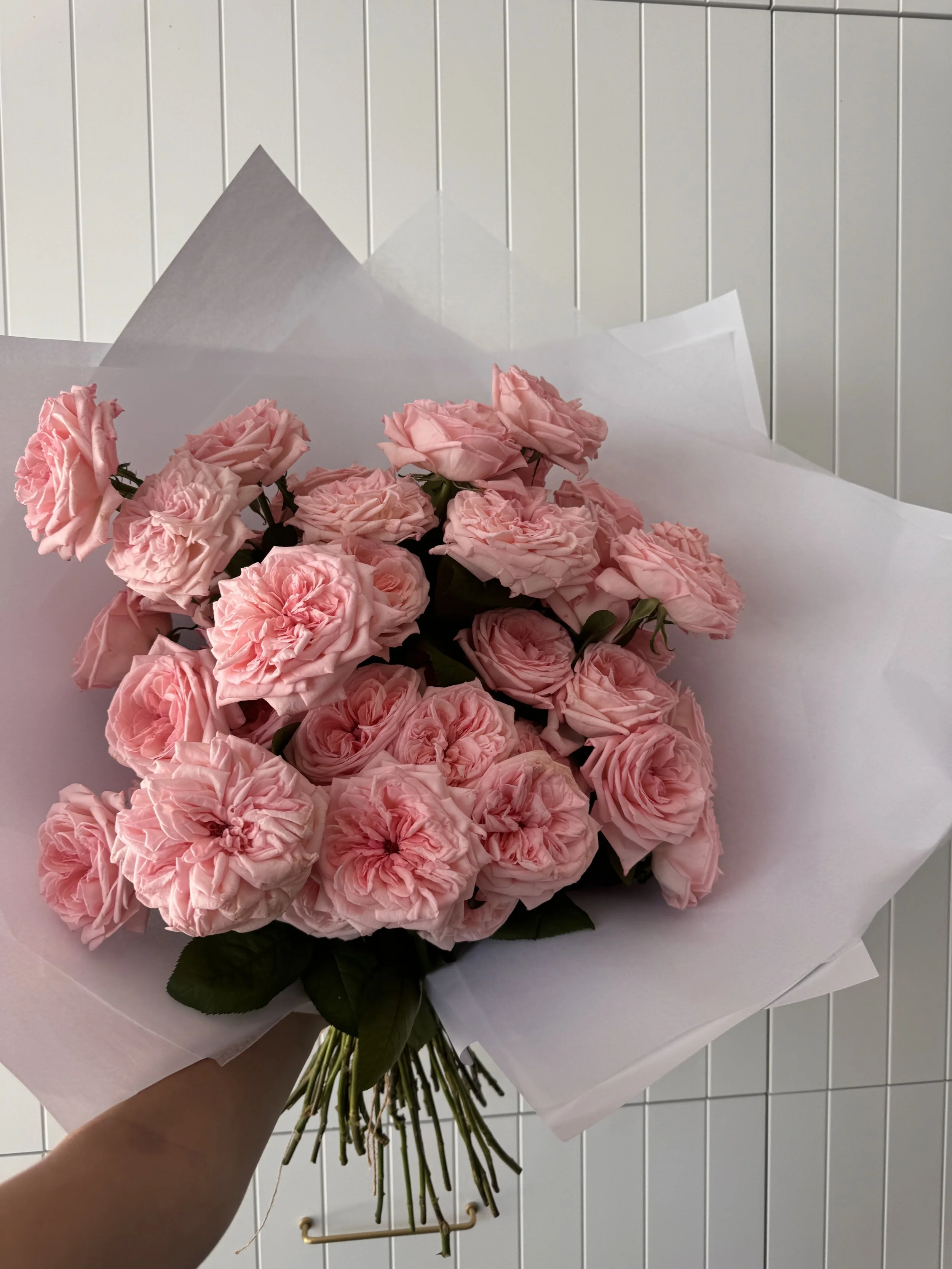 Bouquet of stunning roses in pastel pink, the large size is pictured above. If you would like the bouquet in a different colour please add to the order notes and we will do our best to accommodate your request. The style of rose shown in the photo above is a seasonally flower locally grown in NSW , they have the most beautiful scent and are not available year round.